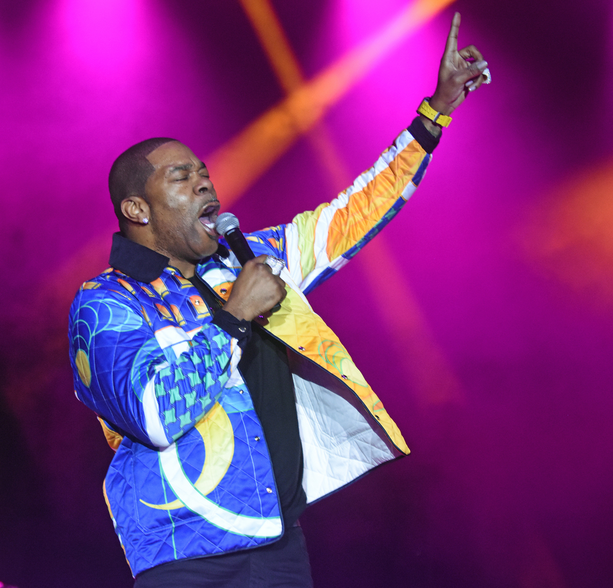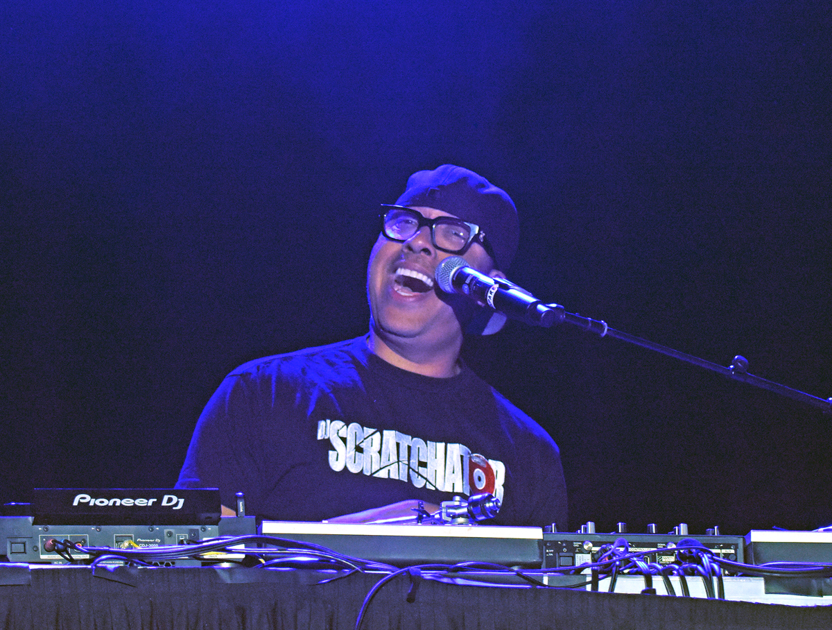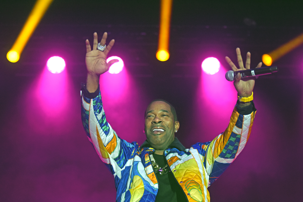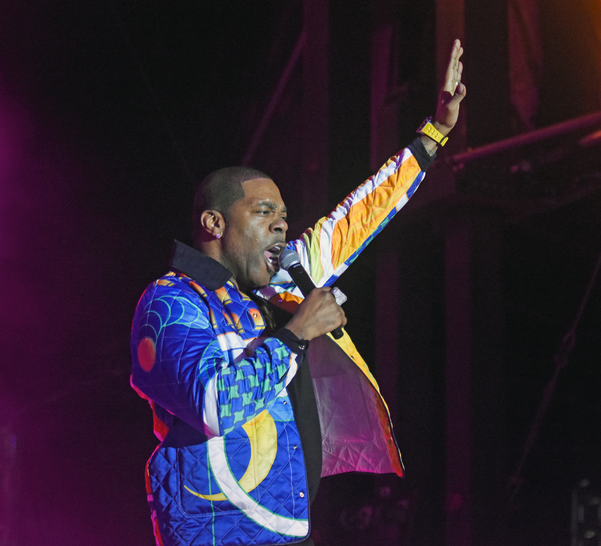 Then came Busta Rhymes’ set, celebrating a 35-year legacy in the music industry and Rap community. Rhymes took the stage flanked by fellow rapper Spliff Star. DJ Scratchator was positioned on a smaller elevated stage at the rear of the main stage delivering the samples and the beats. Rhymes was dressed in a multicolored quilted Casablanca Paris jacket, featuring a rodeo cowboy riding a bucking bronco on the garment’s back. Busta’s bling also stood out, a large silver cross ring on one hand and an even larger dragon ring on the other, all glittering in the stage lights.
